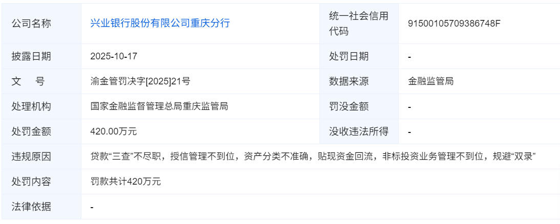 從處罰金額來看,除興業銀行總行外,單家分支機構最高罰款達420萬元。10月17日,興業銀行重慶分行因“貸款‘三查’不盡職,授信管理不到位,資產分類不準確,貼現資金回流,非標投資業務管理不到位,規避‘雙錄’”,被罰款共計420萬元。李妮(時任興業銀行重慶渝中支行行長)、武毅(時任興業銀行重慶分行企業金融南岸業務總部總裁)、舒琴(時任興業銀行重慶加州支行行長)、王衡(時任興業銀行重慶分行企業金融南岸業務一部總監)被警告、鄧珂(時任興業銀行重慶分行營業部總經理)被罰款5萬元。