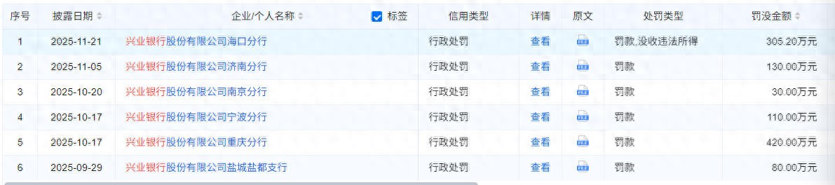 2025年以來,興業銀行的違法違規行為遭到監管部門的密集追責。從??诘街貞c,從北京到寧波,違法違規行為遍布全國多個省份的分支機構,涉及貸款、投資、票據、外匯、個人信貸、客戶身份識別等多個核心業務領域。據不完全統計,興業銀行總行、旗下分支機構及全資子公司收到的百萬級罰單數量已達10張,在12家股份制商業銀行中暫列第一。