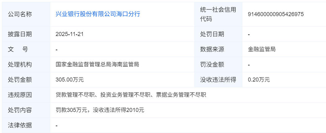 緊隨其后的是興業銀行海口分行,11月21日,因“貸款管理不盡職、投資業務管理不盡職、票據業務管理不盡職”等違法違規行為,被罰款305萬元,沒收違法所得2010元。黎規群、吳剛被警告并罰款共計18萬元;謝紅衛、邢詒深、李偉被警告。