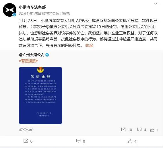 通報發布后,@小鵬汽車法務部 在社交媒體上發文表示,“感謝公安機關的公正執法,也感謝社會各界對該事件的關注。我們堅決維護企業正當權益,對于任何以違法手段損害品牌聲譽、擾亂社會秩序的行為,都將通過法律途徑嚴肅追責,共同營造風清氣正、守法有序的網絡環境。”