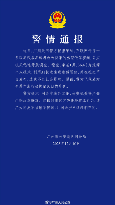 近日,廣州天河警方接報警稱,互聯網傳播一條以某汽車品牌展臺為背景的虛假低俗視頻,公安機關迅速開展調查。經查,李某(男,36歲)為炫耀個人技術,利用AI技術生成虛假視頻,并在社交平臺發布,造成不良社會影響。目前,警方已依法對李某作出行政拘留10日的處罰。