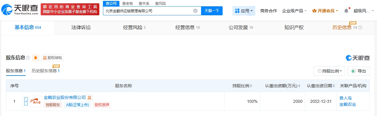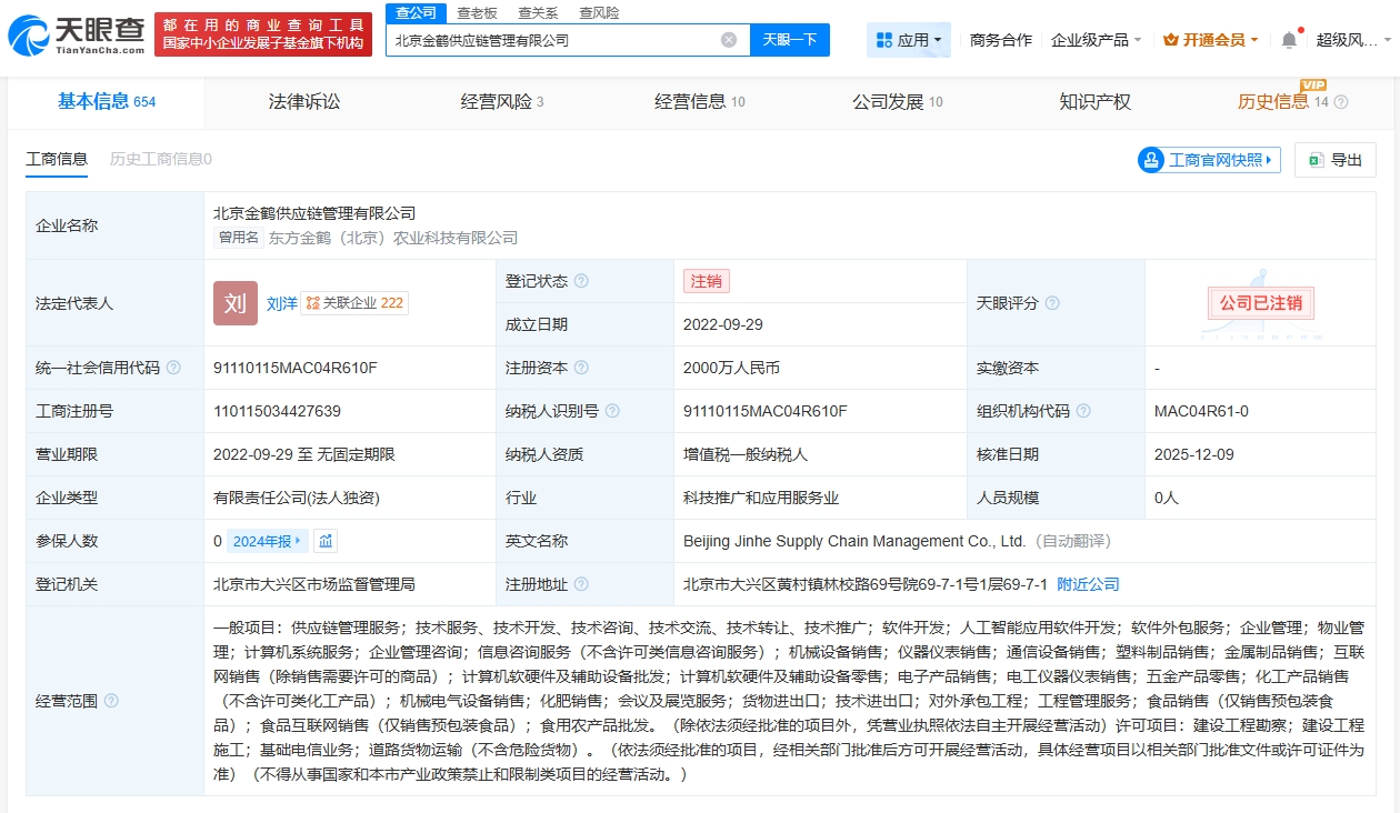 該公司成立于2022年9月,法定代表人為劉洋,注冊(cè)資本2000萬(wàn)人民幣,經(jīng)營(yíng)范圍包括供應(yīng)鏈管理服務(wù)、軟件開發(fā)、人工智能應(yīng)用軟件開發(fā)、軟件外包服務(wù)等。股東信息顯示,該公司由金鶴農(nóng)業(yè)股份有限公司全資持股。