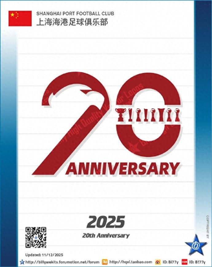 博主“Bi77y”在個人微博寫道:上海海港足球俱樂部在奪得2025賽季中超聯賽冠軍后,在20周年紀念徽標上增加了一座冠軍獎杯,這也算是國內首例實時更新的周年徽標。