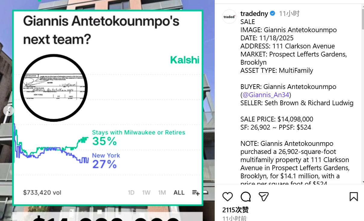 根據美媒Traded報道,字母哥上個月已經在紐約市布魯克林區的克拉克森大道購入一棟包含28套房的公寓大樓,總面積約2500平方米,價值1410萬美元。