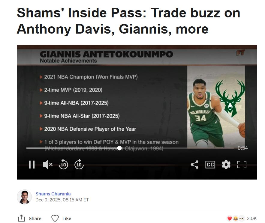 在此之前,ESPN名記Shams才撰寫長文更新字母哥與雄鹿隊目前的狀況,指出字母哥與其經紀人亞歷克斯-薩拉西斯已就字母哥未來與雄鹿隊展開討論。