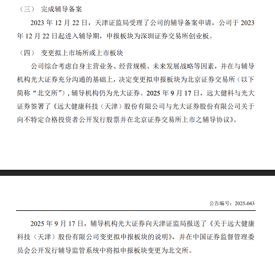 據(jù)查閱,2023年12月,遠大健科通過輔導(dǎo)機構(gòu)光大證券向天津證監(jiān)局報送了首次公開發(fā)行股票并上市的輔導(dǎo)備案登記申請及相關(guān)備案材料,擬申報板塊為深交所創(chuàng)業(yè)板。2025年9月,遠大健科決定變更擬申報板塊為北交所,并在中國證券監(jiān)督管理委員會公開發(fā)行輔導(dǎo)監(jiān)管系統(tǒng)中將擬申報板塊變更為北交所。