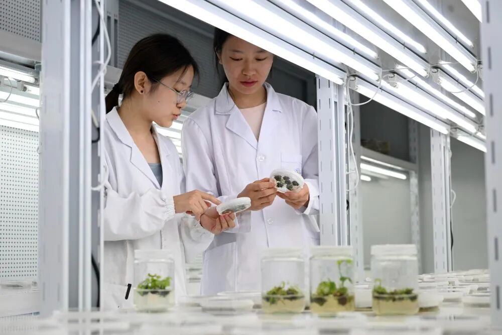 2025年7月6日,研究人員在位于安徽省宿州市的黃淮海(宿州)種業(yè)科技谷南京農(nóng)業(yè)大學(xué)大豆生物育種中心人工氣候室觀察育種材料生長情況。新華社記者 黃博涵 攝