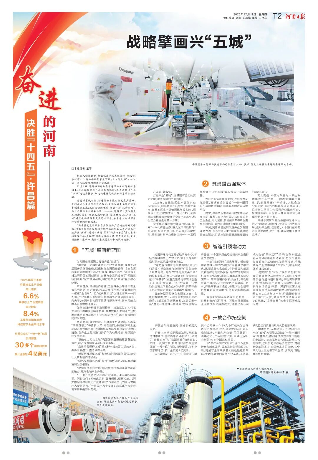 “面對新一輪科技革命和產業變革浪潮,唯有主動擺脫傳統路徑依賴,以集群化發展鍛造筋骨,才能在高質量發展的賽道上搶占制高點、贏得主動權。”正是基于對發展階段的深刻洞察,許昌市委系統提出了“兩融五城四躍升”城市發展戰略,將打造產業“五城”置于核心位置。