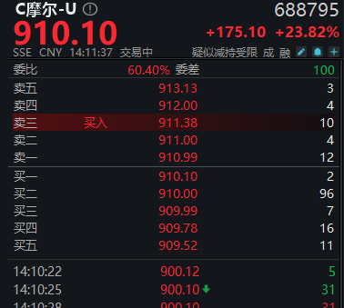 【大河財立方消息】12月11日午后,摩爾線程漲幅進一步擴大,股價突破900元大關,截至發稿報910.10元/股,漲23.82%,市值超4200億元,續創歷史新高。