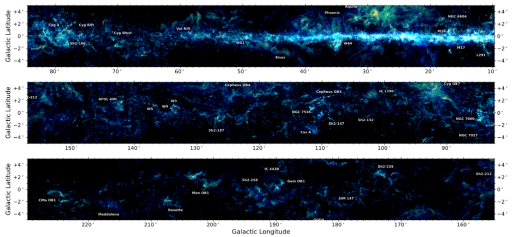 “銀河畫卷”三種一氧化碳同位素譜線數據合成的紅、綠、藍三色圖。圖中標識了著名的恒星形成區或氣體結構,顯示了不同密度環境下的大尺度氣體結構和形態各異的分子云細節。(中國科學院紫金山天文臺供圖)