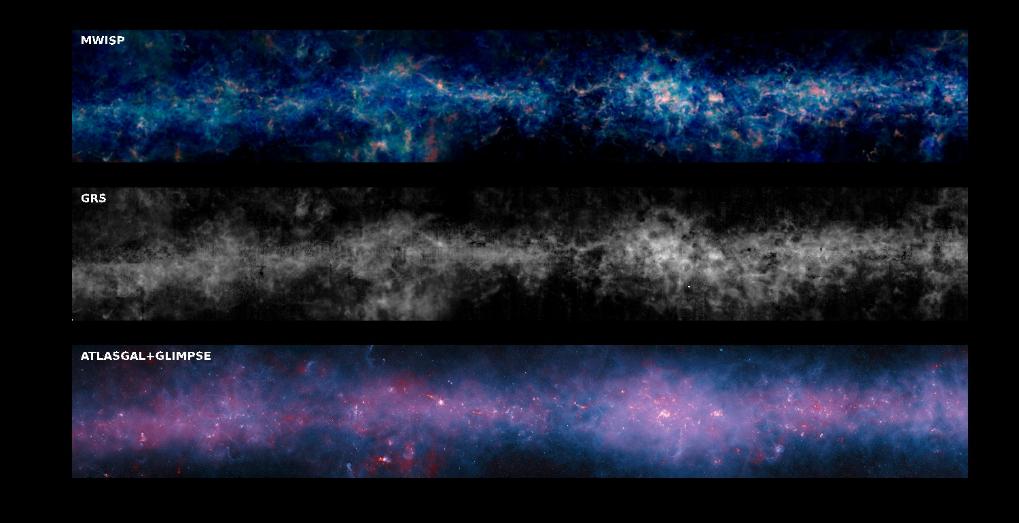 銀緯±1度范圍內“銀河畫卷”巡天與其他巡天的比較圖。上圖是“銀河畫卷”三種一氧化碳同位素譜線,表征不同密度的分子氣體環境;中圖是美國五大學望遠鏡實施的銀河系環巡天積分強度圖;下圖展示了智利阿塔卡馬望遠鏡的銀河系大區域巡天(870微米,紅色)和美國斯必澤銀河系中平面紅外巡天(24微米,藍色)的合成圖,主要展示銀盤上塵埃的熱輻射。(中國科學院紫金山天文臺供圖)