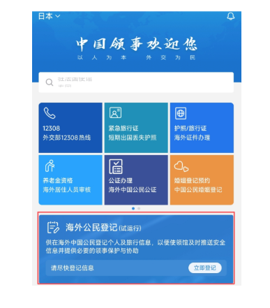為有效保護(hù)在日中國(guó)公民人身安全,進(jìn)一步幫助在日中國(guó)公民更好獲得領(lǐng)事保護(hù)與服務(wù),外交部“中國(guó)領(lǐng)事”APP推出“海外公民登記”功能模塊并已全面上線。中國(guó)駐日本大使館提醒在日中國(guó)公民: