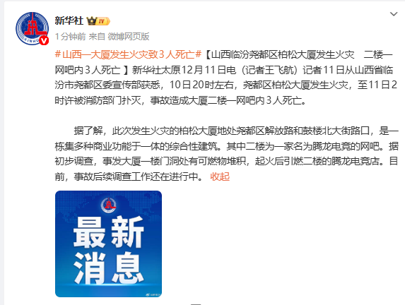 新華社太原12月11日電(記者王飛航)記者11日從山西省臨汾市堯都區委宣傳部獲悉,10日20時左右,堯都區柏松大廈發生火災,至11日2時許被消防部門撲滅,事故造成大廈二樓一網吧內3人死亡。