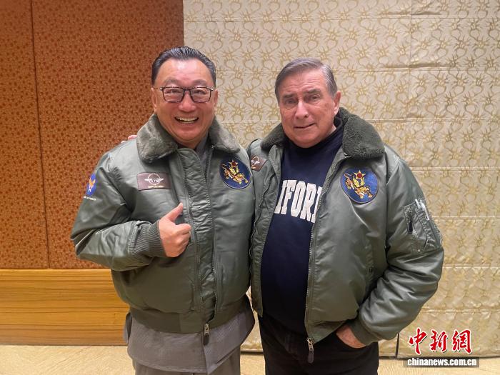 中國和平統一促進會理事、電影《血戰臺兒莊》編劇凌鋒(左)與美中航空遺產基金會主席杰夫·格林(右)。(主辦方供圖)