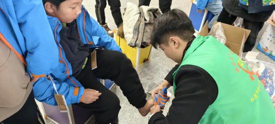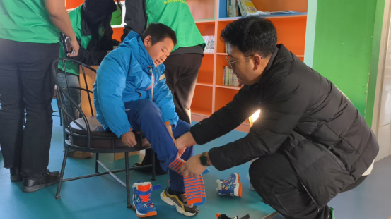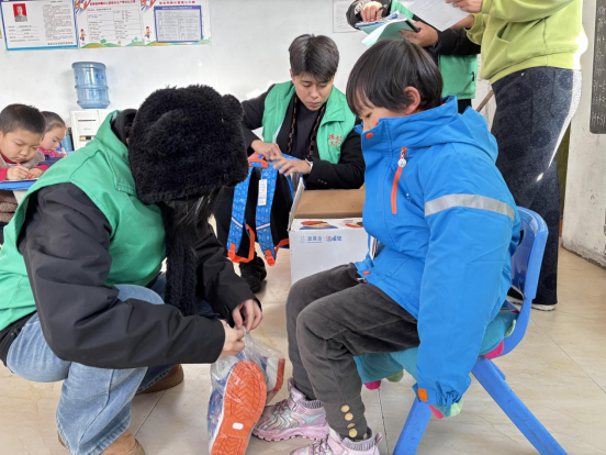 志愿者們帶著溫暖包來到孤羊村小學。在學校老師的帶領下,走進一間普通教室,為一對相依為命的困境姐弟送上冬日禮物。當志愿者將溫暖包送到他們手中時,隨著溫暖包的打開,姐姐看到里面嶄新的沖鋒衣、棉鞋和文具套裝,驚喜地說:"謝謝阿姨,這個藍色沖鋒衣我很喜歡!"弟弟則興奮地拿起一盒彩色畫筆:"我有新畫筆啦!可以畫更多畫了!"志愿者們蹲下來為姐弟倆試穿新衣、新鞋,看著兩個孩子純真的笑容,志愿者們心里暖暖的。