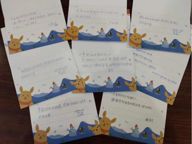 當志愿者打開溫暖包,孩子們看到里面的文具、沖鋒衣、棉鞋、棉襪和玩偶時,孩子們臉上綻放出燦爛的笑容。其中一個孩子興奮地展示她的新棉襪:"這襪子好柔軟,冬天穿一定很暖和!"活動中,孩子們在“我的回信”中寫道:"感謝叔叔阿姨的禮物,今后我會好好學習,報效祖國!"這份純真的反饋,讓志愿者們深刻感受到:這份溫暖不僅在抵御冬寒,更在點亮孩子們心中的希望之光。