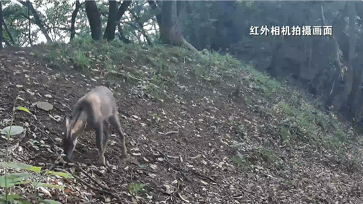 這只可愛的斑羚發現前有紅外相機信號閃爍,立馬警覺地跟鏡頭對視起來,等了半天,又原路返回。兩只斑羚則顯得悠閑自在,不管相機鏡頭拍攝,若無其事地甜食巖石,啃食青草,自顧自地“干飯”。