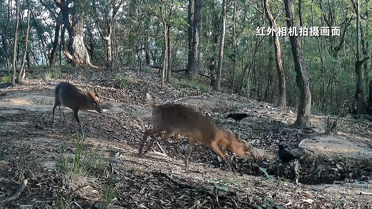 在賽武當國家級自然保護區另外的一些點位上,也抓拍到各類動物同框嬉戲的情景。小麂和烏鴉同時在線,一只調皮的烏鴉飛到小麂的背上,歇歇腳,小麂也是毫不在意,各自安好。
