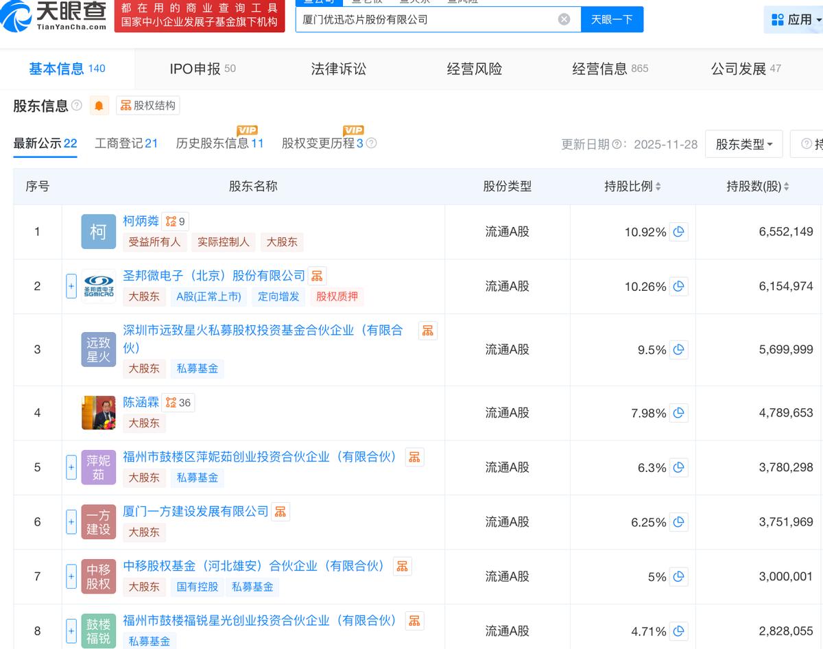 天眼查App信息顯示,優迅股份成立于2003年2月,前身為廈門優迅高速芯片有限公司。目前,該公司的注冊資本為6000萬元,法定代表人為柯炳粦,主要股東包括柯炳粦、圣邦股份等。