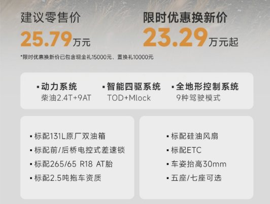 雙油箱+柴油動力,1400km續航告別補給焦慮。最讓玩家興奮的核心亮點,莫過于原廠雙油箱+2.4T柴油動力組合!雙油箱總容積達131L,搭配WLTC工況8.9L/100km的低油耗,滿油續航直接突破1400公里。這意味著穿越西北無人區、戈壁荒漠時,再也不用背著危險油桶“冒險前行”,真正實現“油滿箱、心無慌”的無補給穿越自由。