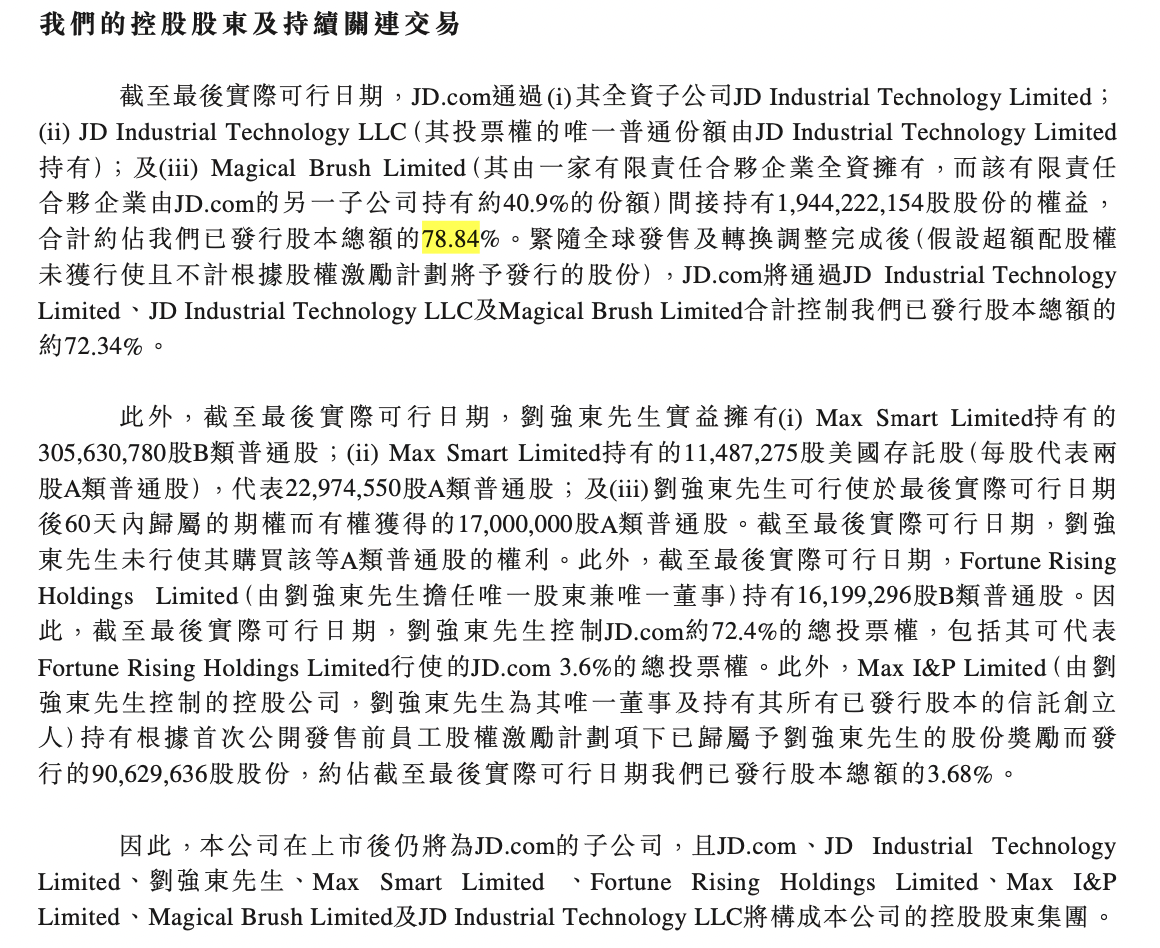 IPO前 ,JD.com通過其全資子公司JD Industrial Technology Limited;JD Industrial Technology LLC(其投票權的唯一普通份額由JD Industrial Technology Limited 持有;及Magical Brush Limited(其由一家有限責任合伙企業全資擁有,而該有限責任合伙企業由JD.com的另一子公司持有約40.9%的份額)間接持有1,944,222,154股股份的權益,合計約占公司已發行股本總額的78.84%。