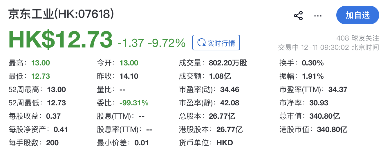 瑞財經 吳文婷 12月11日,京東工業(07618.HK)在港交所掛牌上市,美銀證券、高盛、海通國際、瑞銀為聯席保薦人。其開盤報12.73港元,跌9.72%,總市值約340.8億港元。