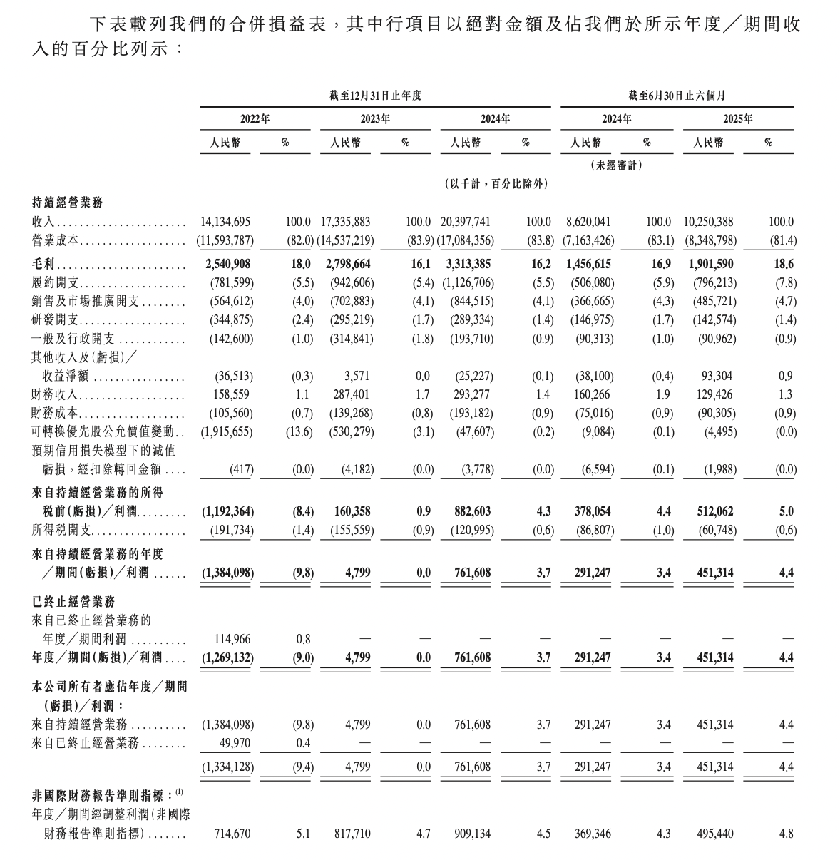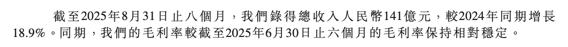 截至2025年8月31日止八個月,公司錄得總收入141億元,較2024年同期增長18.9%。同期,毛利率較截至2025年6月30日止六個月的毛利率保持相對穩定。