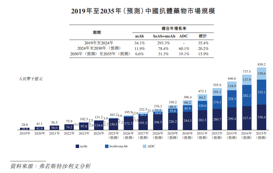 中國抗體藥物市場規模從2019年的人民幣288億元迅速增長至2024年的人民幣1,312億元,復合年增長率為35.4%。未來十年,隨著更多抗體藥物納入國家醫保藥品目錄、生物類似藥的可及性提高以及創新抗體產品的上市,中國抗體藥物市場預計將從2024年的人民幣1,312億元增長至2030年的人民幣3,964億元,復合年增長率為20.2%,并進一步增至2035年的人民幣8,302億元,2030年至2035年的復合年增長率為15.9%。按產品類型劃分,單克隆抗體預計仍將是最大的細分市場,而雙特異性及多特異性抗體和ADC均預計錄得更快增長。特別是,中國的ADC市場預計將從2024年的人民幣39億元顯著擴大至2030年的人民幣662億元及2035年的人民幣1,586億元,2024年至2030年的復合年增長率為60.1%,2030年至2035年的復合年增長率為19.1%。下圖載列2019年至2035年中國抗體藥物市場的歷史及預測規模。