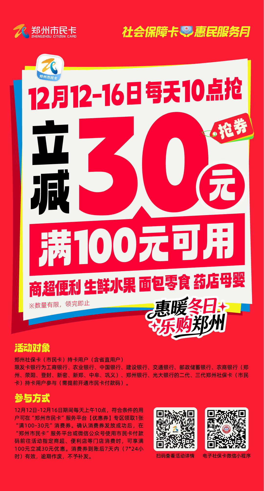 12月11日,頂端新聞記者從鄭州市人社局了解到,明日(12月12日)起至12月16日每天上午10點,鄭州社保卡(市民卡)將發放新一批消費券,鄭州社保卡(含省直)用戶可通過鄭州市民卡APP參與領取。