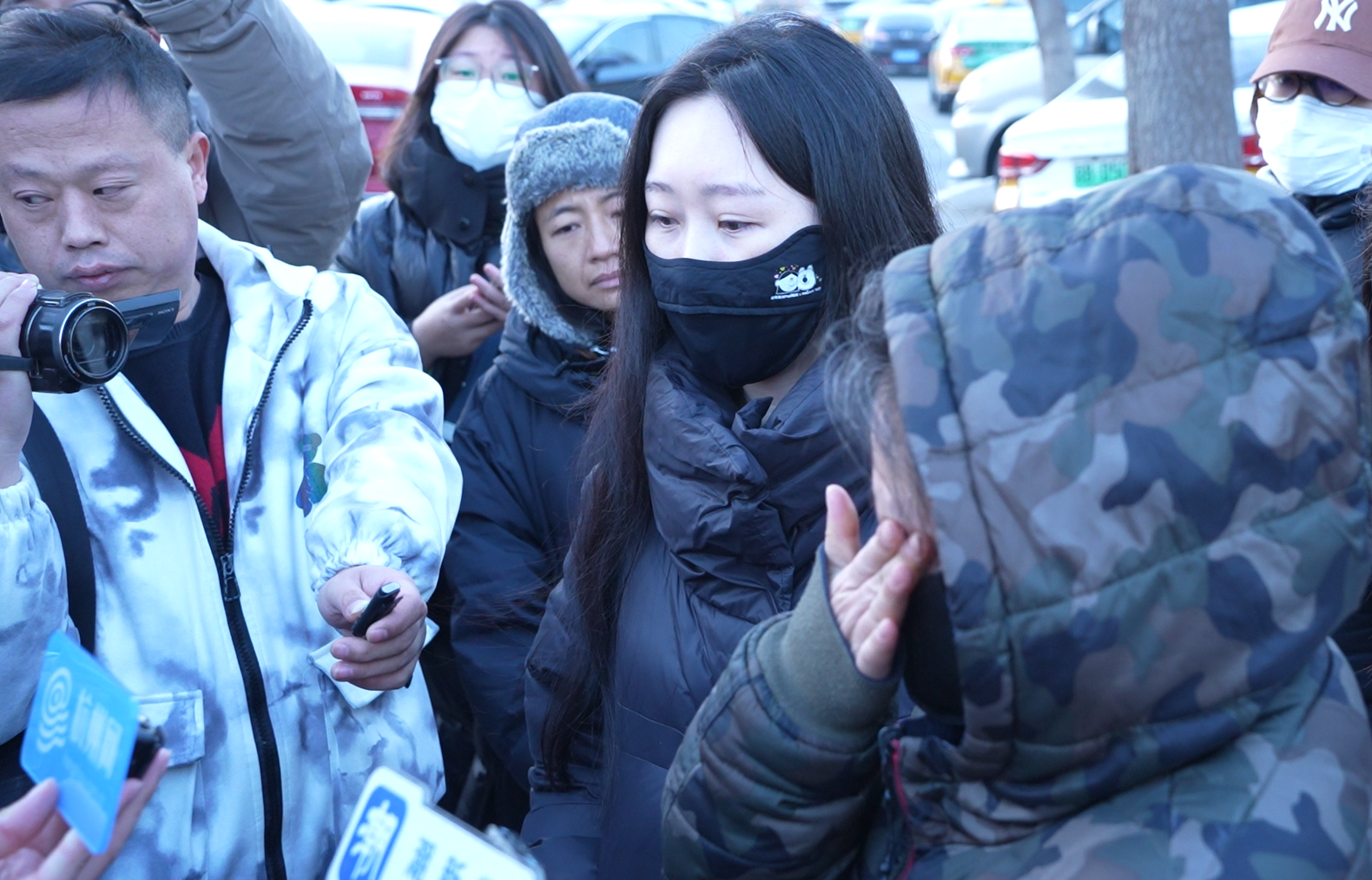 12月11日上午,在北京市朝陽區人民法院溫榆河法庭外,北京首例寵物犬中毒刑事公訴案宣判前,被害犬只Papi的主人李女士(畫面中戴黑色口罩者)接受記者采訪。實習生 王流軒/攝