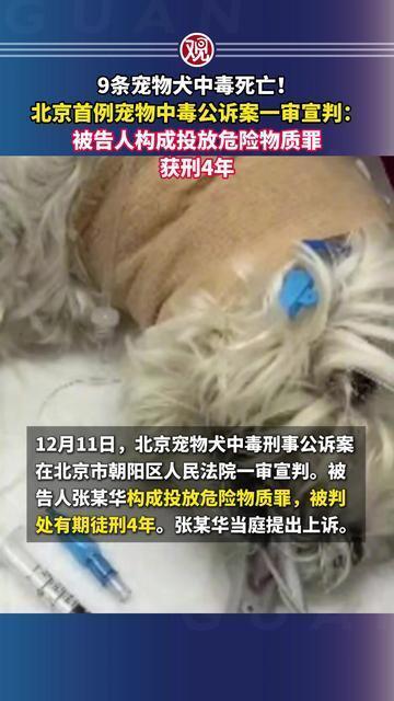 今天上午,北京首例寵物犬中毒刑事公訴案在北京市朝陽區人民法院溫榆河法庭一審宣判。被告人張某華構成投放危險物質罪,被判處有期徒刑4年。