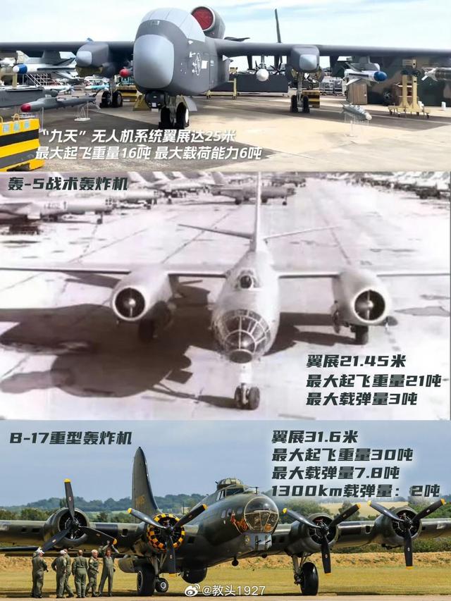 “九天”到底有多大?先看幾個(gè)數(shù)字:翼展25米,最大起飛重量16噸,最大載荷能力6噸。這個(gè)載荷能力是什么概念?美國(guó)當(dāng)前主力無(wú)人機(jī)死神MQ-9無(wú)人機(jī)最大起飛重量4.8噸,最大載荷只有1.7噸;二戰(zhàn)主力轟炸機(jī)B-17,最大載彈量也不到8噸。這么大的載重能力已經(jīng)遠(yuǎn)超現(xiàn)役全部無(wú)人機(jī)了,讓它可以干很多別的無(wú)人機(jī)干不了的活。