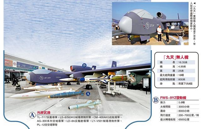 這架無(wú)人機(jī)的命名也挺有講究,“九天”兩個(gè)字出自《孫子兵法》中的“善攻者,動(dòng)于九天之上”,寓意能在萬(wàn)米高空作戰(zhàn)。從技術(shù)參數(shù)看,“九天”采用渦扇發(fā)動(dòng)機(jī),最大飛行高度達(dá)到15000米,最大飛行速度超過(guò)700公里每小時(shí),最大航程7000公里,航時(shí)超過(guò)12小時(shí)。這個(gè)航程和續(xù)航時(shí)間,足以讓它從內(nèi)陸基地起飛,飛到第一島鏈外執(zhí)行任務(wù),然后安全返回。