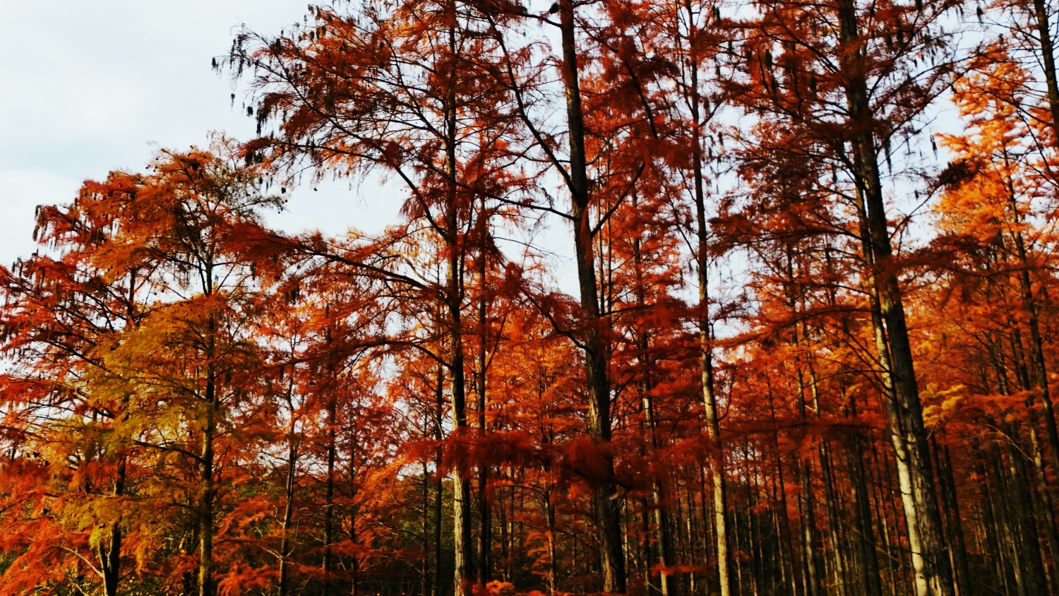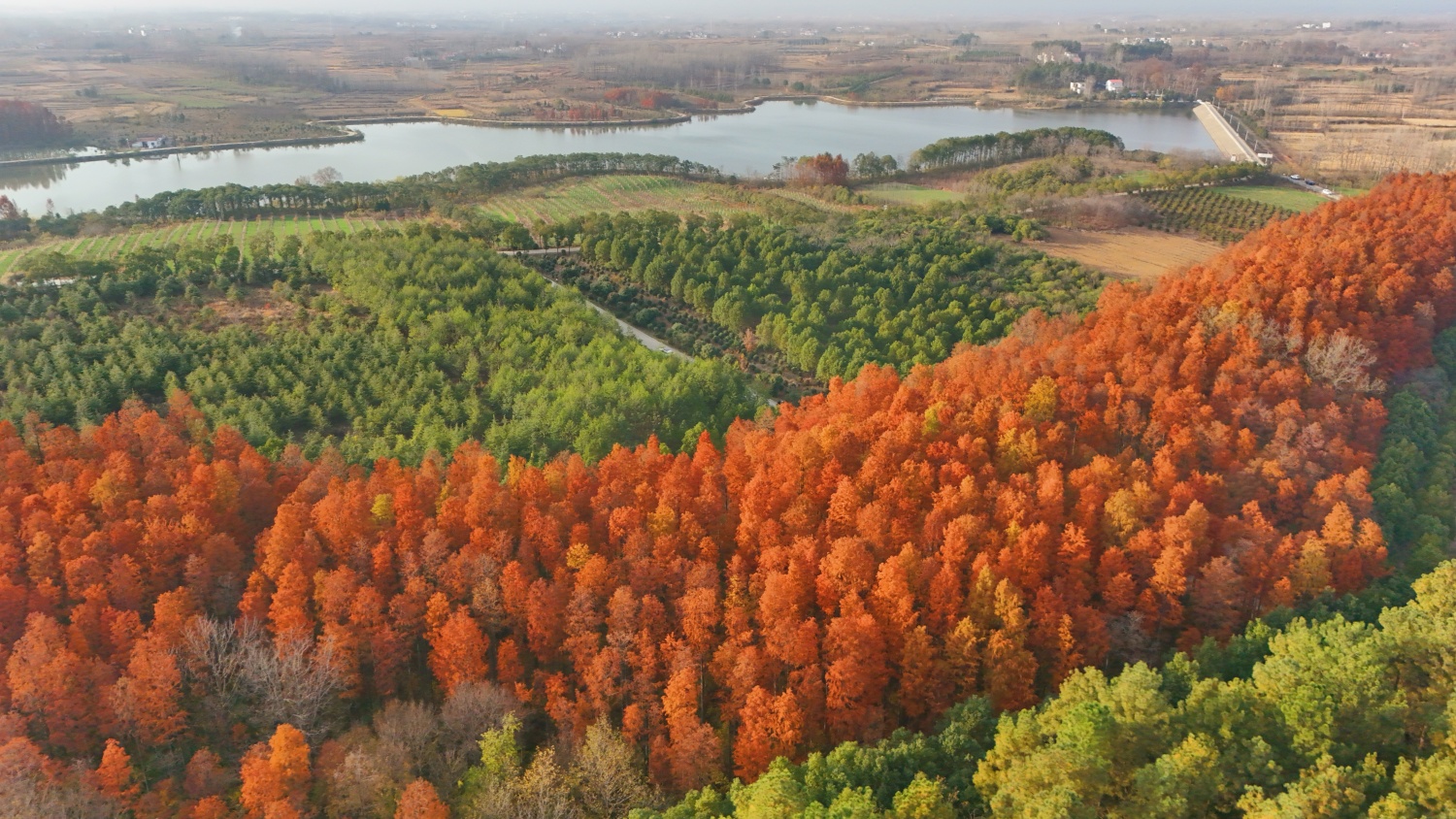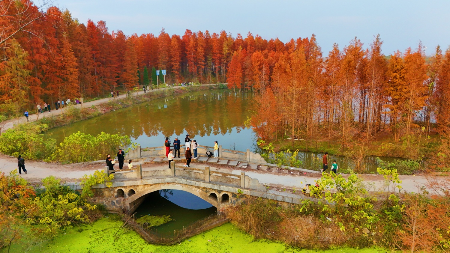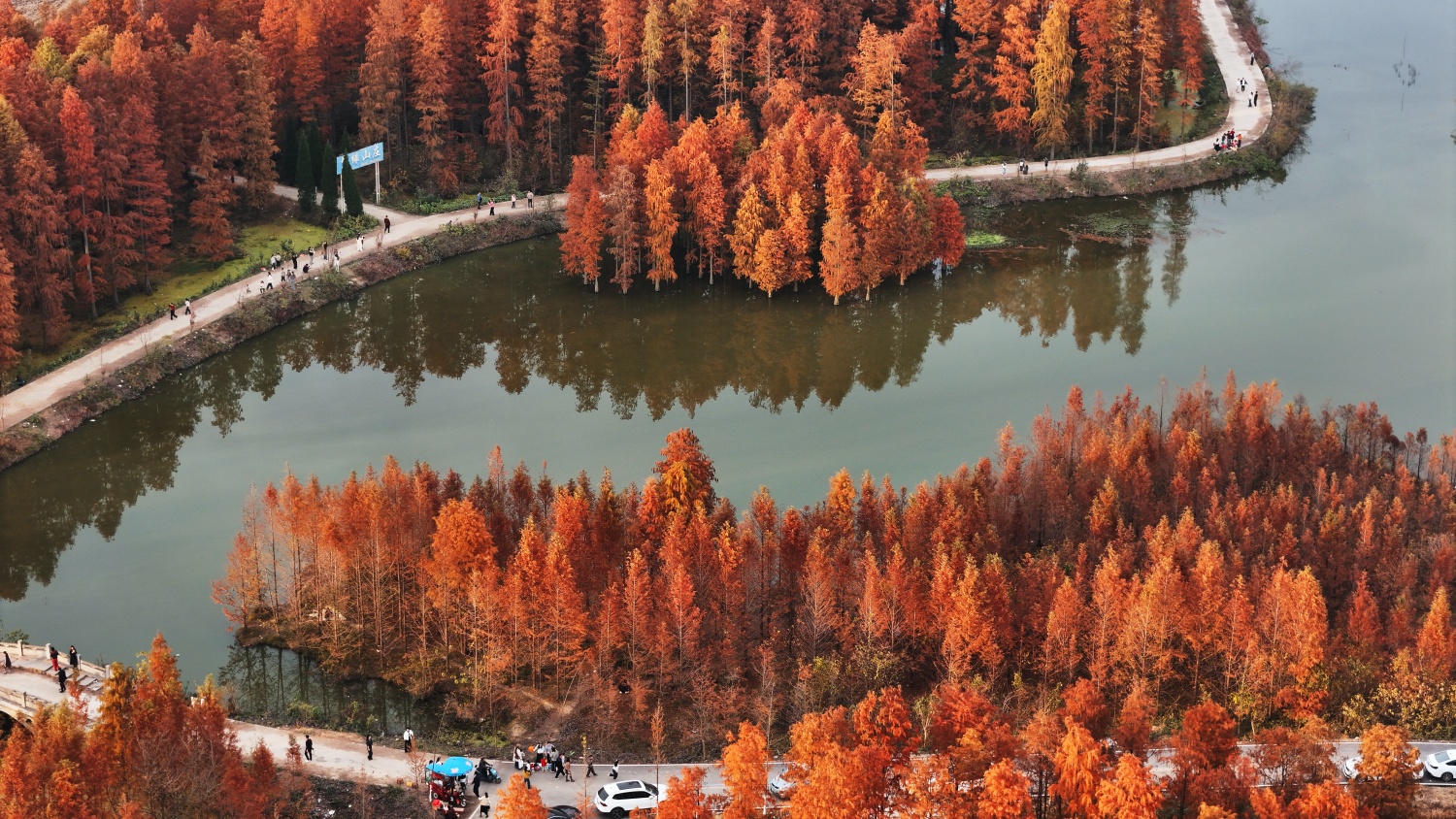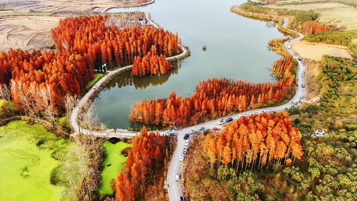 12月11日,固始縣胡族鋪鎮楊店林區內,成片水杉林褪去青翠,披上濃烈丹紅,進入一年中最富詩意的觀賞時節。冬日暖陽下,斑斕樹影與靜謐湖水交相輝映,宛如油畫,吸引了眾多游客前來漫步打卡。