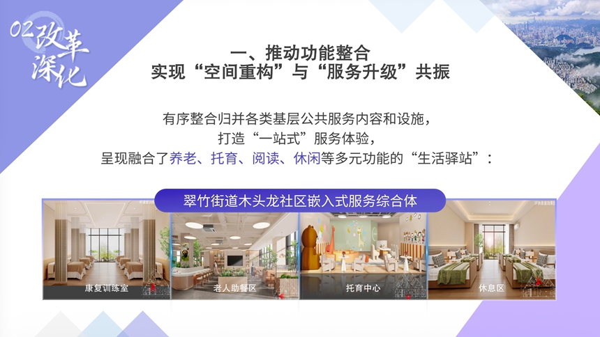 以翠竹街道木頭龍社區為例,3000平方米公共空間打造成“社區嵌入式綜合服務體”。在這里,社區老人可以參與文娛活動、享用長者飯堂,雙職工家庭可獲得靈活托育服務,居民不出社區就能健身、學樂器,參與各類文體興趣培訓。