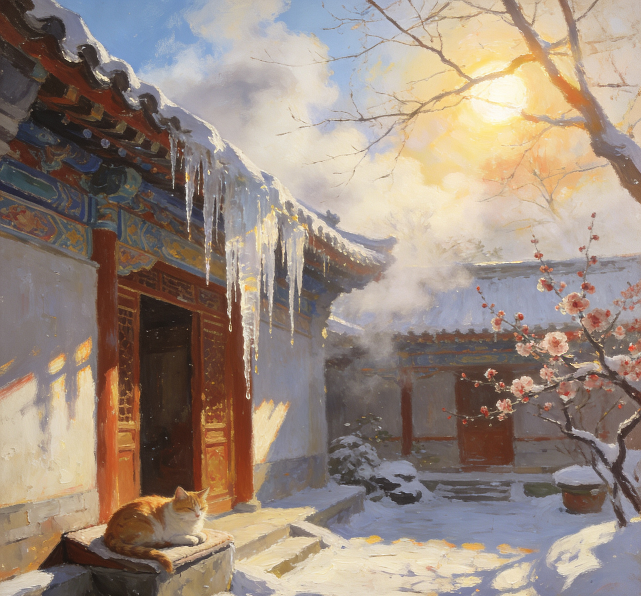金烏破霧透晴光,檐角貍奴曬暖陽。