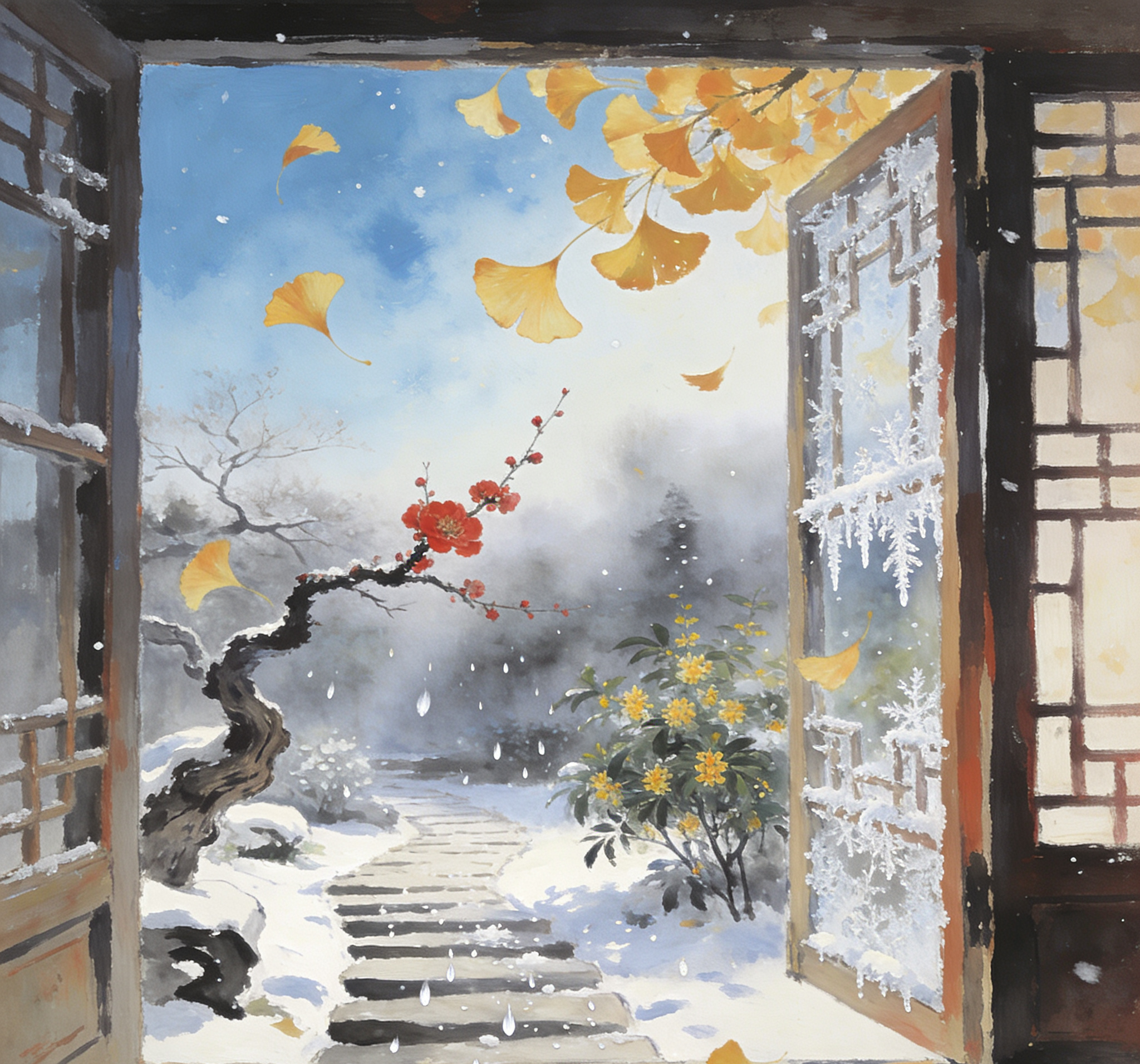 冰花凝牖詩窗瘦,墨韻濡箋暖意融。