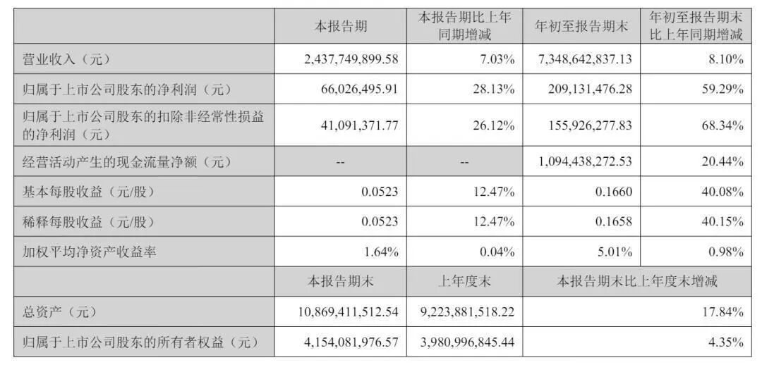 2025年前9個月營收為73.49億元,較上年同期的68億元增長8%;期內利潤為2.29億元,上年同期的期內利潤為1.55億元。其中第三季度營收為24.38億元,同比增長7%;凈利為6602萬元,同比增長28%;扣非后凈利為4109萬元,同比增長26%。