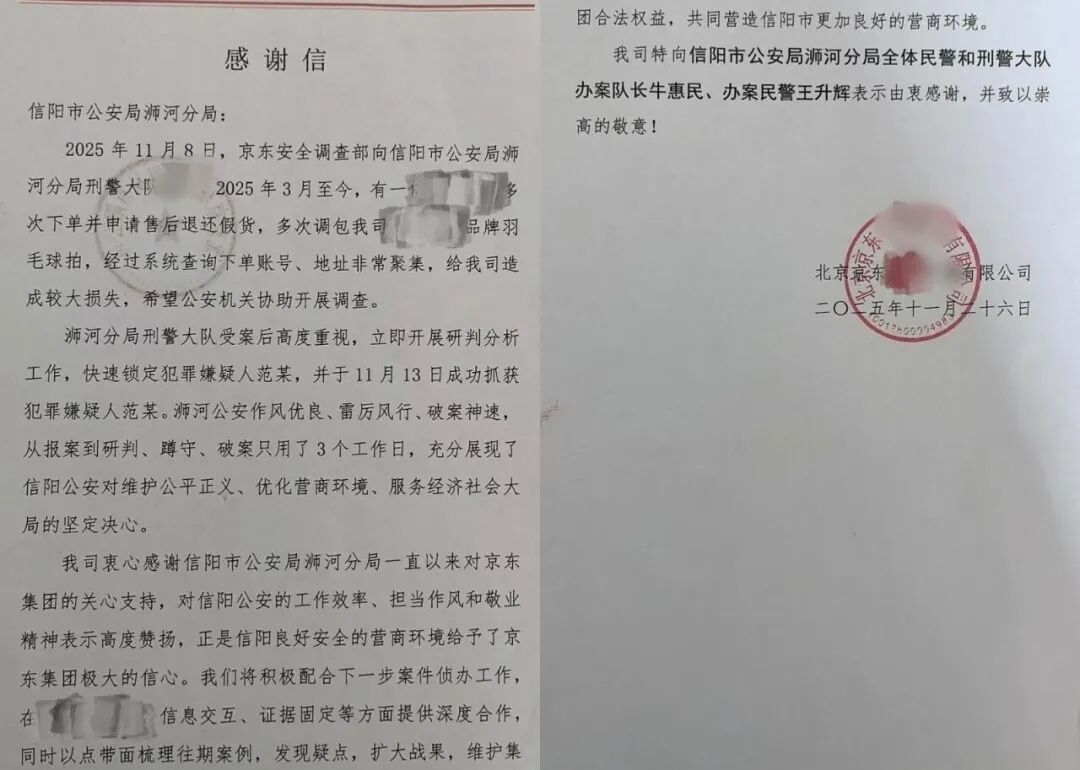 2025年11月初,該公司發現其京東自營專區的某知名品牌羽毛球拍被調包,有3個賬戶多次下單并申請售后退款,退還的卻是假羽毛球拍。接警后,浉河警方根據線索展開偵查,搜集并固定相關證據,11月13日,民警在工區路某小區將嫌疑人范某抓獲。