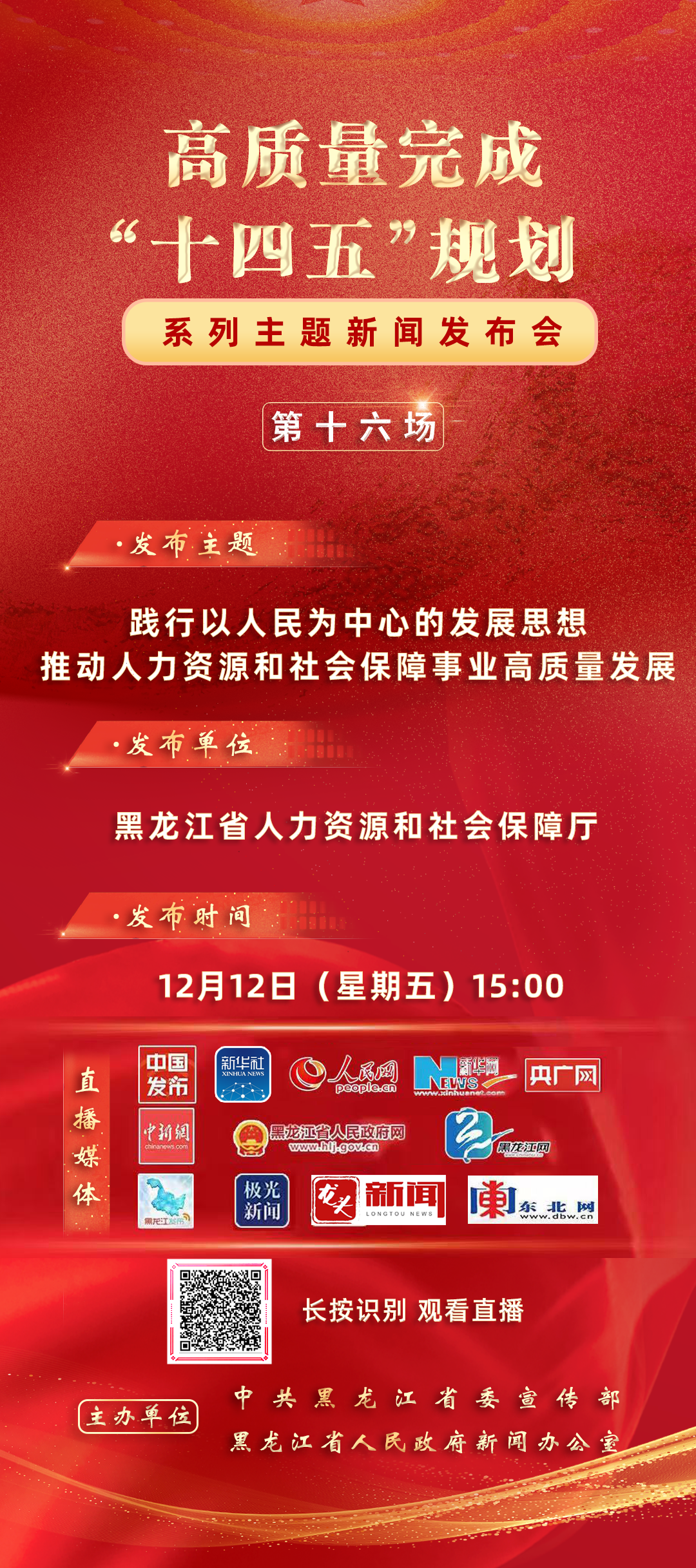 由中共黑龍江省委宣傳部、黑龍江省人民政府新聞辦公室主辦的“高質量完成‘十四五’規劃”系列主題新聞發布會將于12月12日(星期五)15:00舉行第十六場。圍繞“踐行以人民為中心的發展思想 推動人力資源和社會保障事業高質量發展”作專題發布。邀請黑龍江省人力資源和社會保障廳主要負責同志介紹情況,并與相關負責同志共同回答記者提問,以及事先通過網絡征集的熱點問題,歡迎大家掃碼觀看!