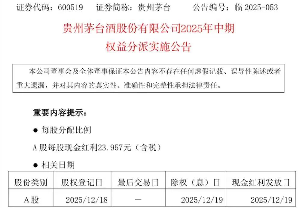 貴州茅臺(600519)12月10日晚間公告,公司2025年中期利潤分配方案已獲股東大會通過,將以總股本12.52億股為基數(shù),每股派發(fā)23.957元現(xiàn)金紅利(含稅),共計派發(fā)300.01億元(含稅)。股權登記日為2025年12月18日,除權(息)日和現(xiàn)金紅利發(fā)放日均為2025年12月19日。本次分派對象為:截至股權登記日下午上海證券交易所收市后,在中國證券登記結(jié)算有限責任公司上海分公司登記在冊的公司全體股東。