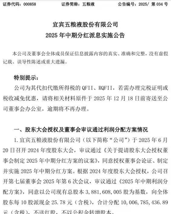 同日,五糧液公告稱,公司召開第七屆董事會2025年第6次會議,審議通過《2025年中期利潤分配方案》,同意以公司現(xiàn)有總股本38.82億股為基數(shù),向全體股東每10股派現(xiàn)金25.78元(含稅),合計分配100.07億元(含稅),不送紅股,不以公積金轉(zhuǎn)增股本。股權登記日為2025年12月17日,除權除息日為2025年12月18日。本次分派對象為:截至2025年12月17日下午深圳證券交易所收市后,在中國證券登記結(jié)算有限責任公司深圳分公司登記在冊的公司全體股東。