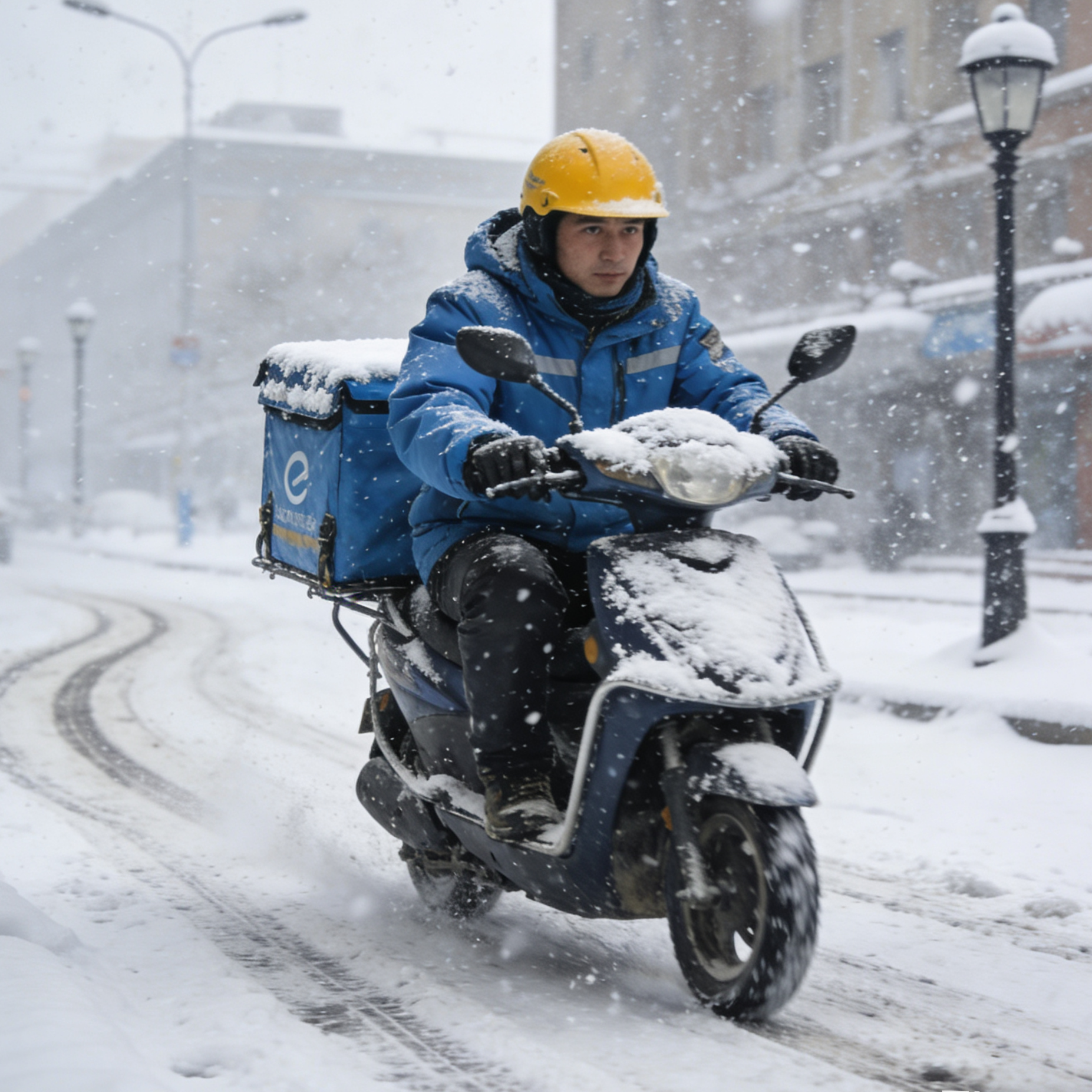 街角緩行的身影格外扎眼,外賣小哥戴著深色安全帽,帽檐、領(lǐng)口都積著細(xì)碎雪粒,凍得發(fā)僵的深藍(lán)色工裝裹著單薄身形,風(fēng)扯著衣擺簌簌作響,寒意順著布料縫隙往里鉆。電動車輪碾過冰面,偶爾碾出細(xì)碎的打滑聲,他雙腳始終貼著地面輕撐,粗糙的鞋面凝著厚冰,鞋縫里嵌著凍硬的雪塊,每往前挪一段,都要穩(wěn)穩(wěn)控著車把調(diào)整平衡,車身在寒風(fēng)里微微晃悠,卻從沒停下前行的節(jié)奏。
