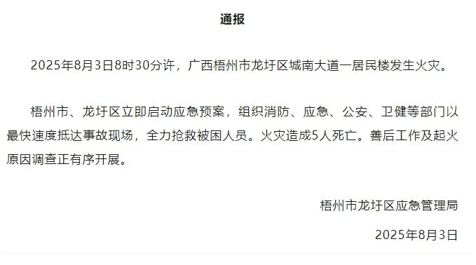 2025年8月3日,廣西梧州市龍圩區城南大道一居民樓發生火災,造成5人死亡。