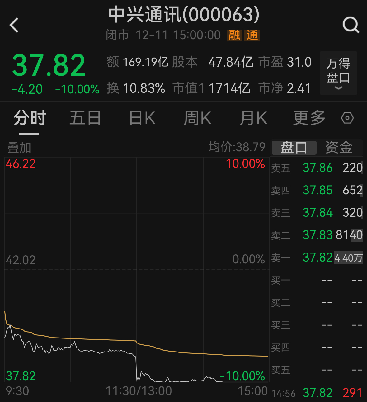 不過,聲明發布后,其股價頹勢未改,投資者情緒持續承壓。截至收盤,中興通訊A股跌停,報收37.82元/股(前復權,下同),換手率高達14.21%,成交額突破169億元,市值縮水至1809億元。港股跌至27.50港元/股,跌幅達13.08%,換手率達14.08%。