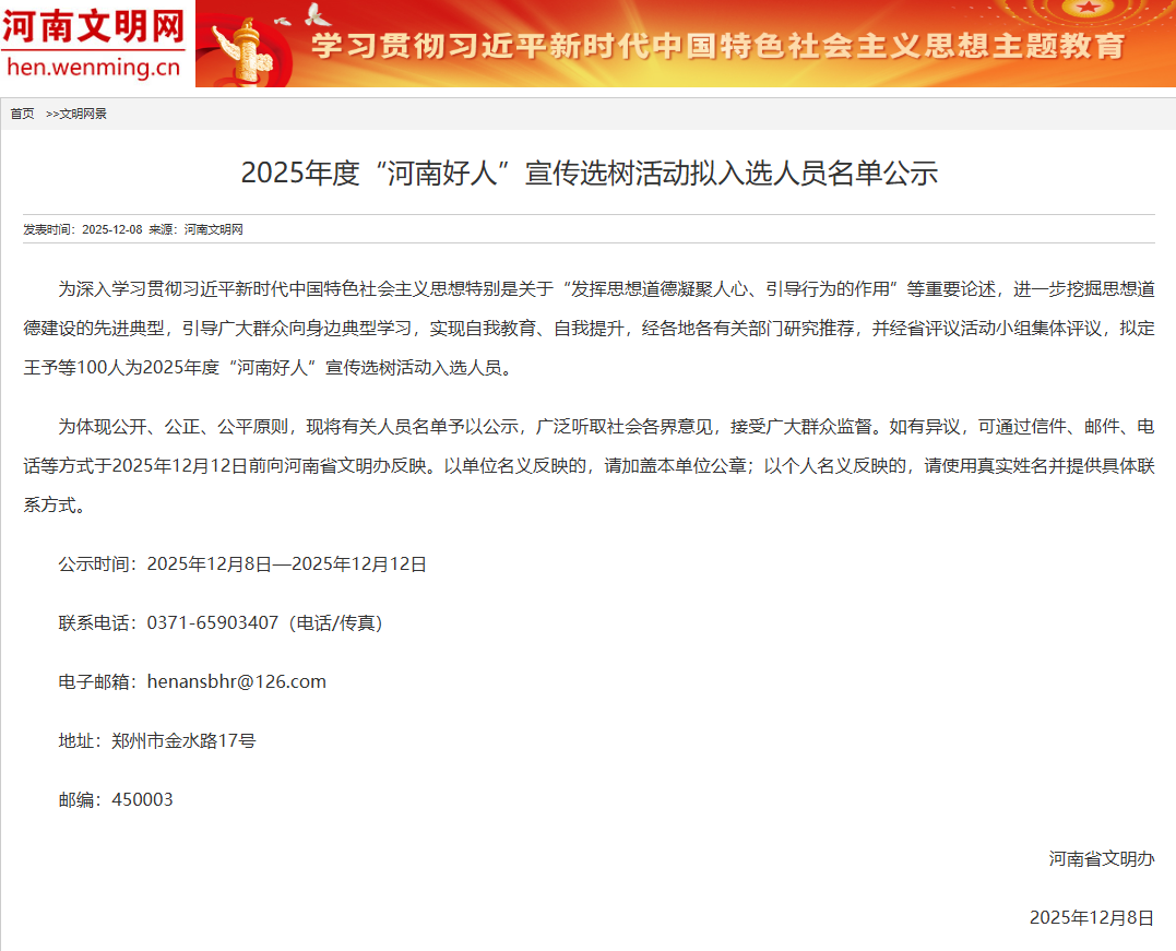 為體現公開、公正、公平原則,現將有關人員名單予以公示,廣泛聽取社會各界意見,接受廣大群眾監督。如有異議,可通過信件、郵件、電話等方式于2025年12月12日前向河南省文明辦反映。以單位名義反映的,請加蓋本單位公章;以個人名義反映的,請使用真實姓名并提供具體聯系方式。