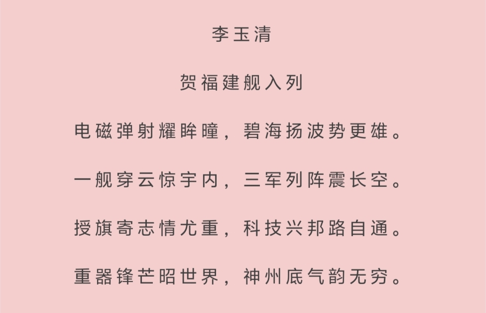- 情感基調昂揚向上:全詩無一絲沉郁,從“耀”“雄”“驚”“震”到“昭”“韻無窮”,用詞鏗鏘有力,節奏明快昂揚,既寫出福建艦入列的震撼瞬間,又傳遞出新時代中國“平視世界”的自信,堪稱一首禮贊強軍、謳歌祖國的時代壯歌,讀來讓人熱血沸騰、心生自豪。