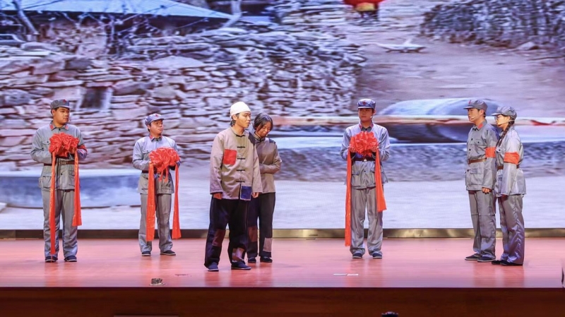 “這不僅是演出,更是教學。”這樣的理念貫穿排練始終。教師們在節目編排中,有意識地將理論講述轉化為情感體驗,將思政元素與革命精神融入臺詞、動作和舞臺之中,引導學生在角色中理解歷史、在演繹中體悟精神。從紅旗渠精神到核潛艇堅守,從紅色貨幣的初心到鄉村振興的擔當,每一個細節都被賦予教育的意義,每一次排練都成為一次深入的思想對話。在反復排練中,學生們逐漸從“演人物”走向“懂人物”,從“背臺詞”變為“說心聲”。紅旗渠故事中的“鐵姑娘”,讓他們理解了什么是集體奮斗;黃旭華的事跡,讓他們懂得了何為“干驚天動地事,做隱姓埋名人”;黃文秀的選擇,讓他們看到了新時代青年的責任擔當。