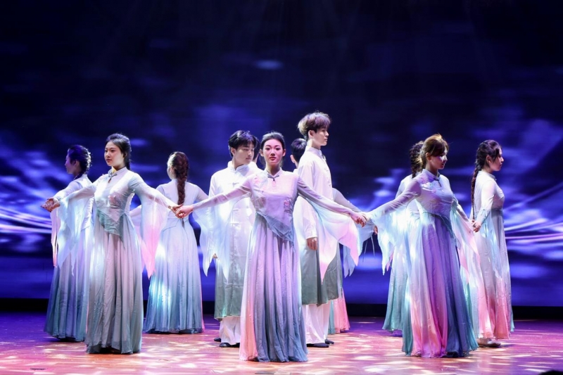 整場節目以《烽火丹心》《山河壯志》《青春征程》三大篇章為主線,用藝術的語言重現百年歷程中的信仰與奮斗。“后生,接旗!”計算機學院學生一聲吶喊,將觀眾帶回烽火連天的歲月;“一定要讓鄉親們過上好日子!”數字商貿學院學生飾演的“黃文秀”,道出了新時代青年的擔當。從《八子參軍》的壯烈,到《人民幣的誕生》背后的初心;從《無聲的誓言》中一輩人的堅守,到《請黨放心,強國有我》的青春強音,九個原創節目串聯起一部百年精神傳承的生動教材。