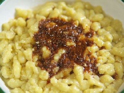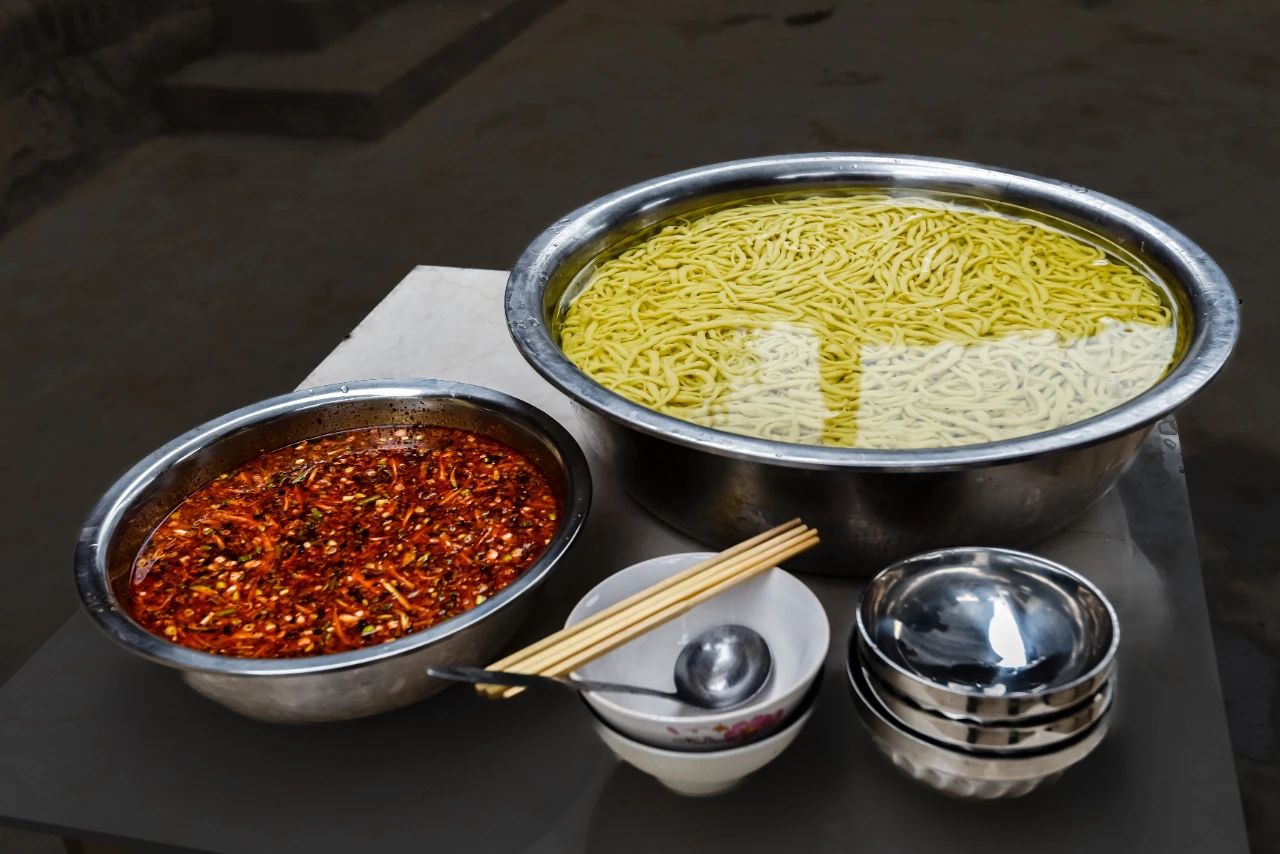 “蛤蟆圪蛤蟆圪蚪蚪”是豫西一帶的地方面食特產,也是傳統美食名吃,因形似小魚又得名“黃面魚”。原材料選用當地一年一熟的老玉米面粉,將玉米面粉攪成糊狀放入開水鍋中,攪拌煮熟,用勺子盛出,倒入漏瓢之內,順其自然慢慢漏入備用涼白開水中,自然形成蛤蟆蝌蚪之形狀,即成黃面魚。用農家自制酸菜和小蒜炒成料汁,再放米醋和油潑辣子,色澤黃亮,辣椒紅而不燥,野蒜翠綠香醇,口感滑彈,味道酸辣爽口,老少皆宜。